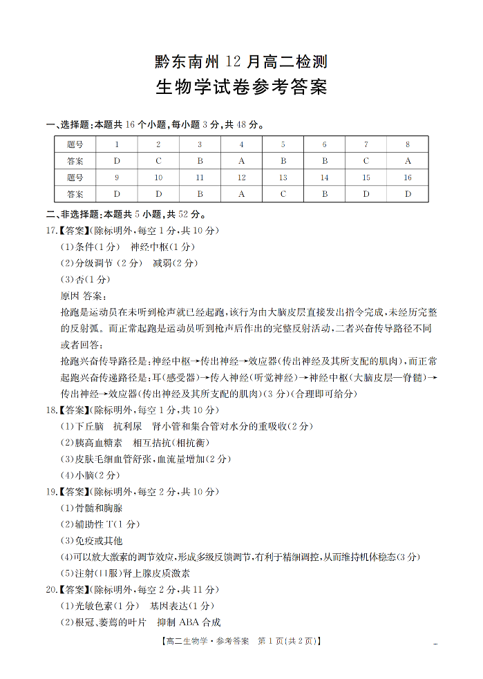 高二生物答案--贵州省黔东南州2025-2026学年高二上学期12月检测试卷