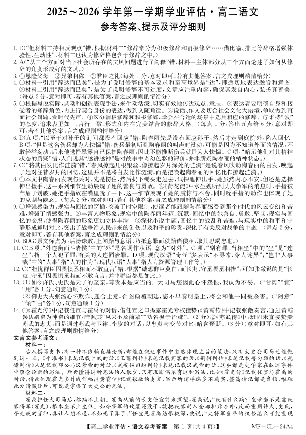 高二语文答案--河北省2025-2026学年高二第一学期学业评估
