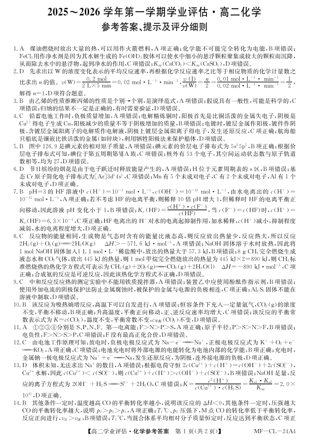 高二化学答案--河北省2025-2026学年高二第一学期学业评估