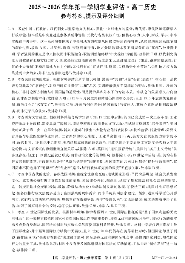高二历史答案--河北省2025-2026学年高二第一学期学业评估