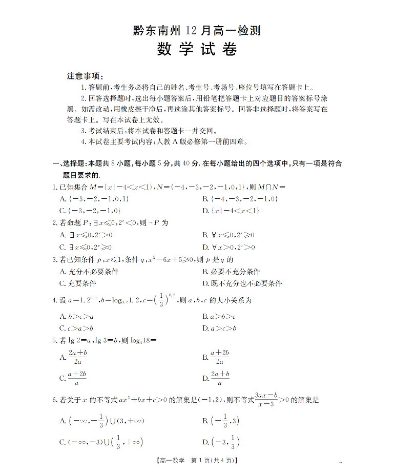 高一数学--贵州省黔东南州2025-2026学年高一上学期12月检测试卷