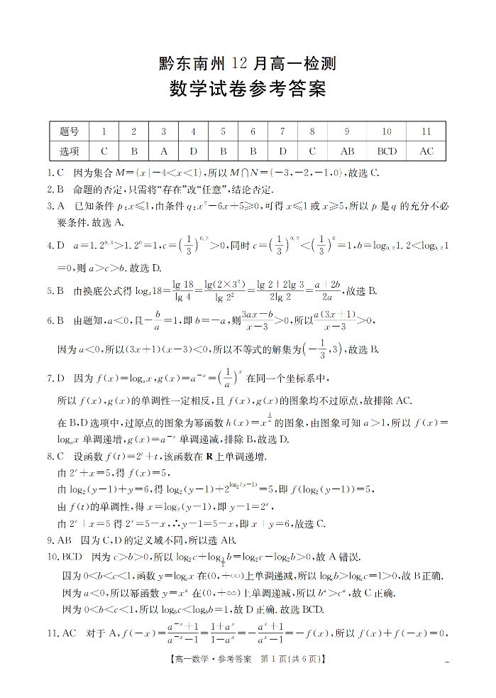 高一数学答案--贵州省黔东南州2025-2026学年高一上学期12月检测试卷