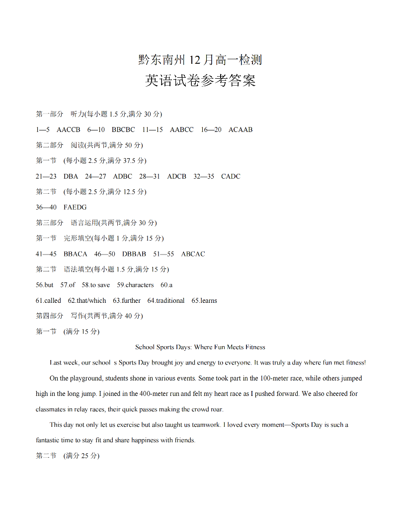 高一英语答案--贵州省黔东南州2025-2026学年高一上学期12月检测试卷