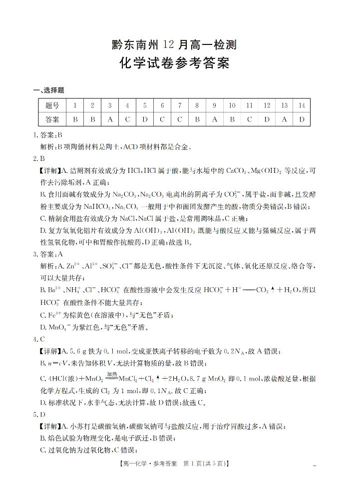 高一化学答案--贵州省黔东南州2025-2026学年高一上学期12月检测试卷