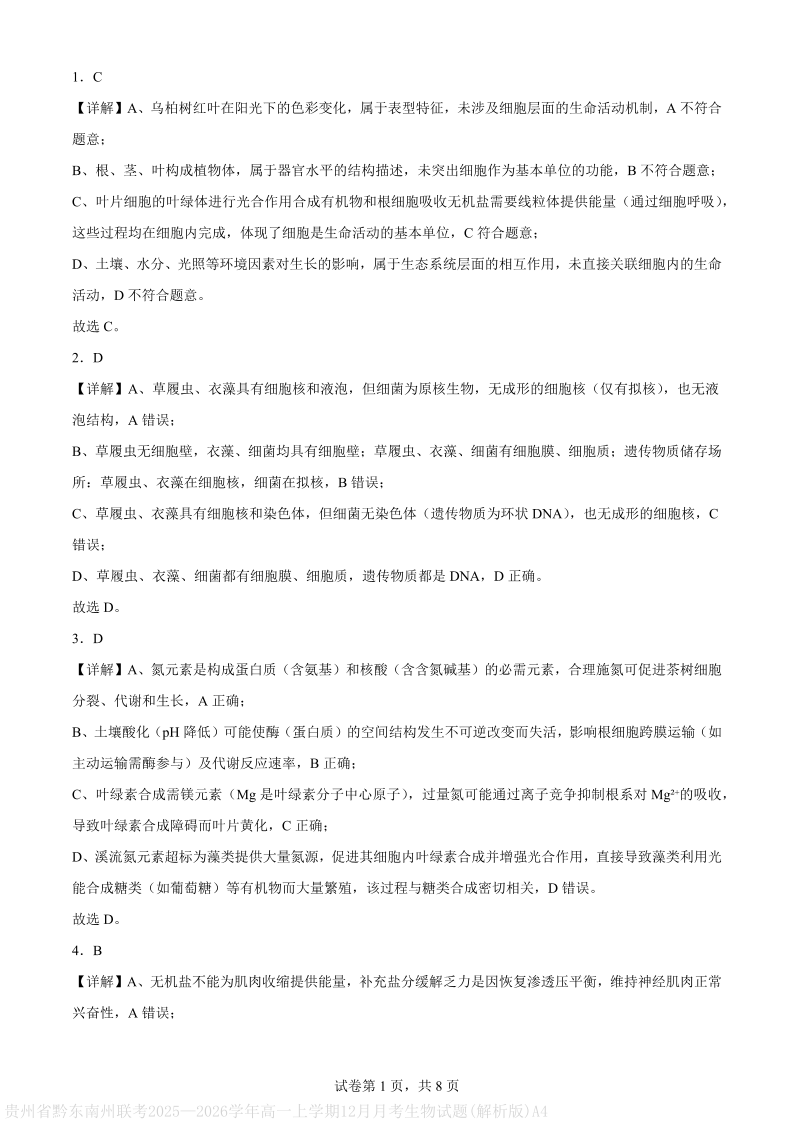 高一生物(解析版)--贵州省黔东南州2025-2026学年高一上学期12月检测试卷