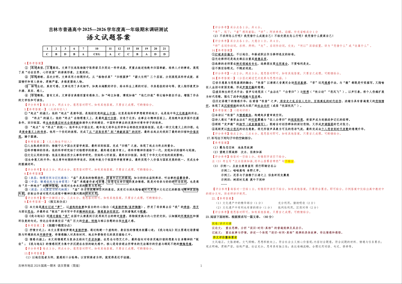 高一语文答案--吉林省吉林市2025-2026学年高一上学期期末考试