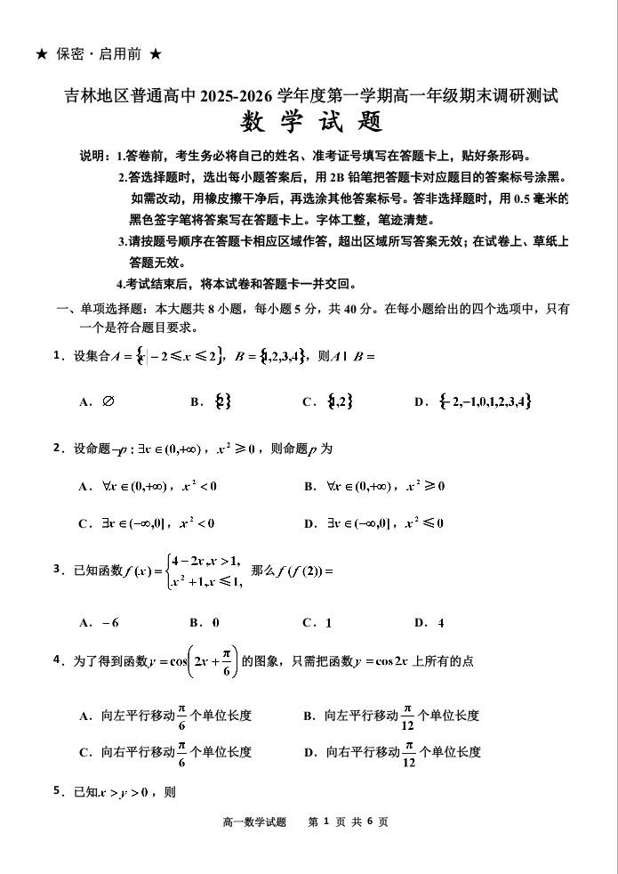 高一数学--吉林省吉林市2025-2026学年高一上学期期末考试