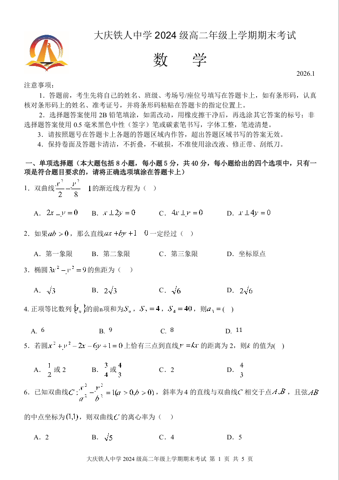 高二数学--黑龙江省大庆铁人中学2025-2026学年高二上学期期末考试