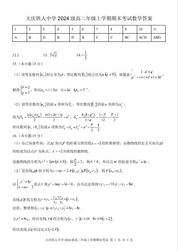 高二数学答案--黑龙江省大庆铁人中学2025-2026学年高二上学期期末考试