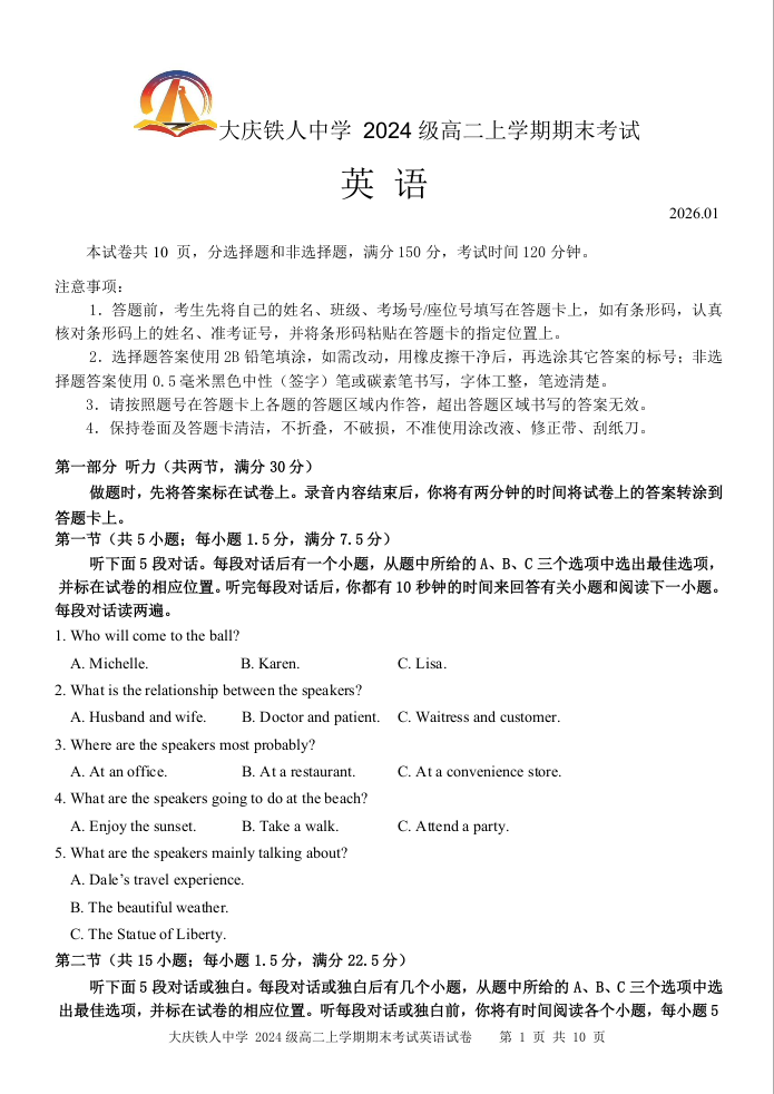 高二英语--黑龙江省大庆铁人中学2025-2026学年高二上学期期末考试