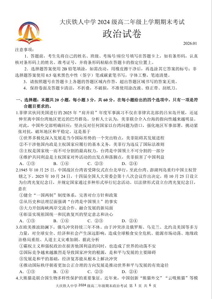 高二政治--黑龙江省大庆铁人中学2025-2026学年高二上学期期末考试