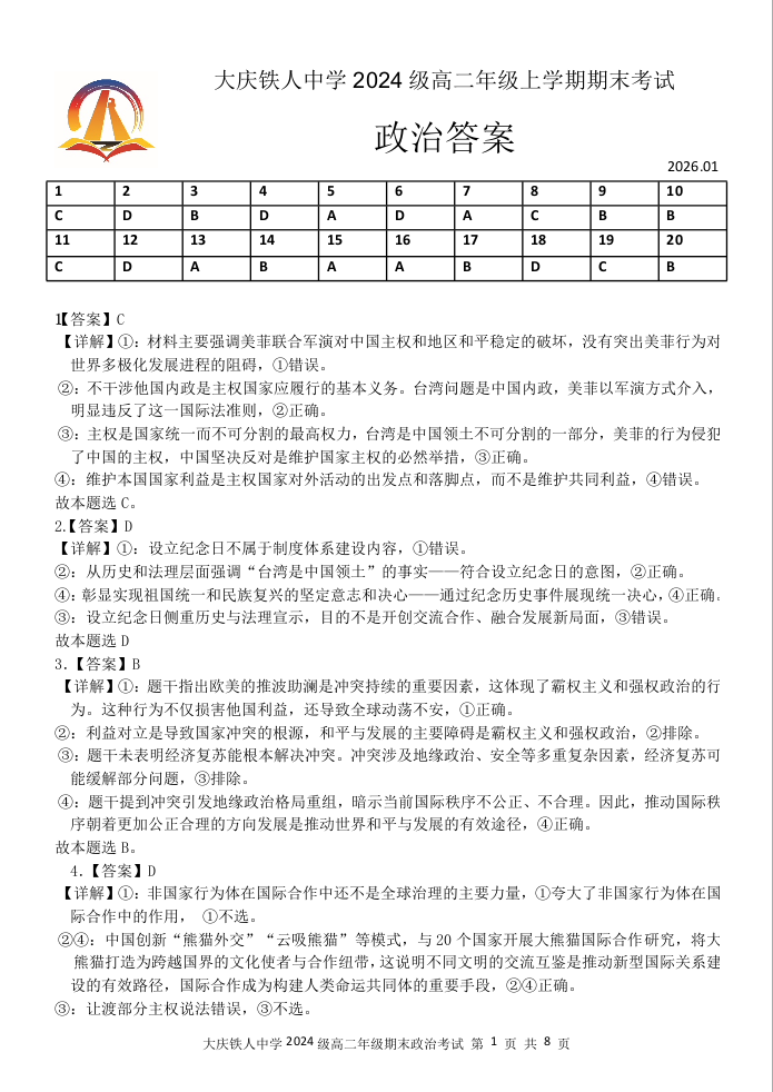 高二政治答案--黑龙江省大庆铁人中学2025-2026学年高二上学期期末考试