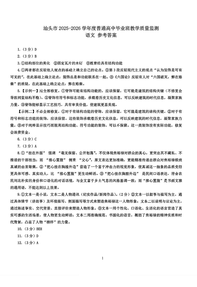 高三语文答案--广东省汕头市2026届高三上学期1月教学质量监测
