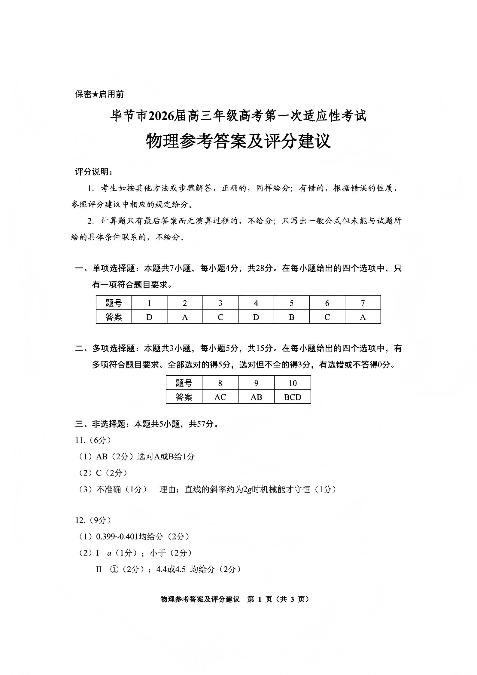 高三物理答案--贵州省毕节市2026届高三年级高考第一次适应性考试(毕节一诊)