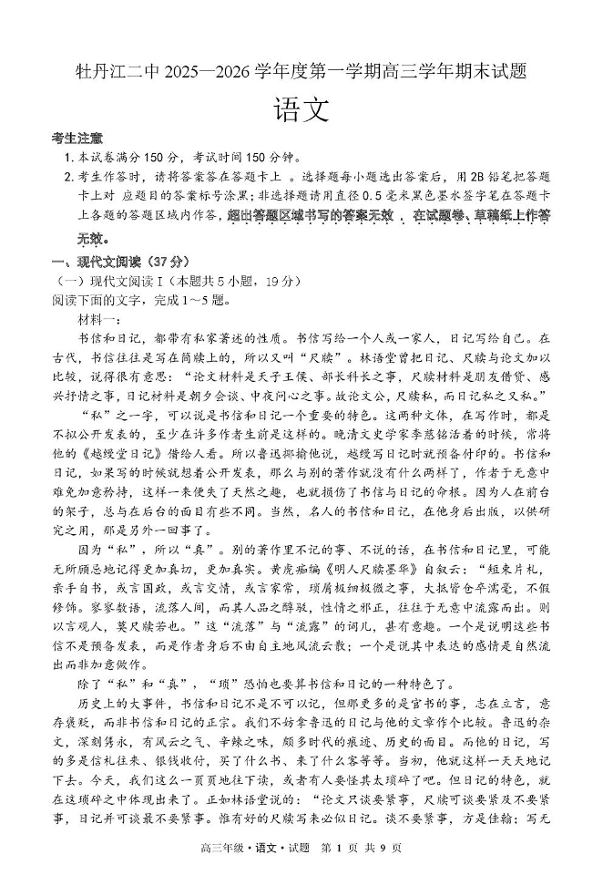 高三语文--黑龙江省牡丹江市第二高级中学2026届高三上学期1月期末考试