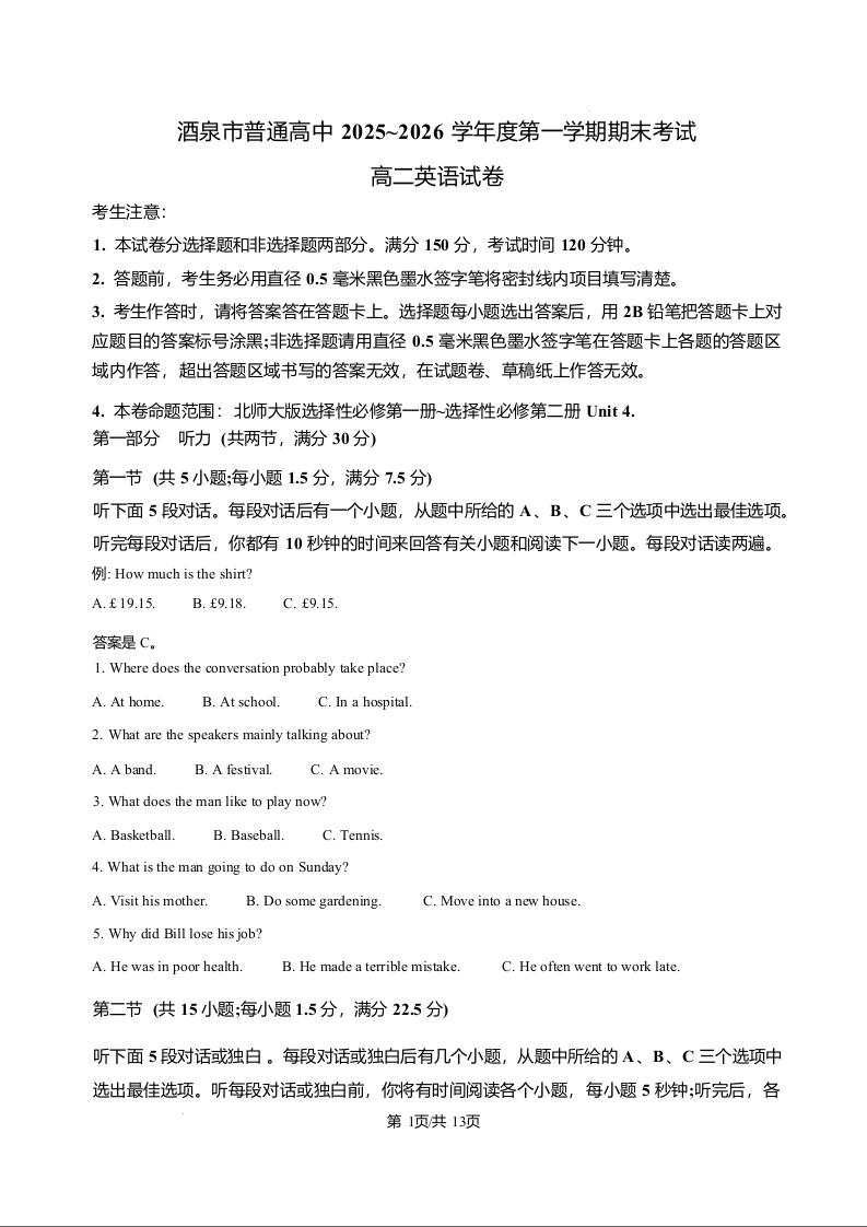 高二英语+答案--甘肃省酒泉市普通高中2025-2026学年高二上学期1月期末考试