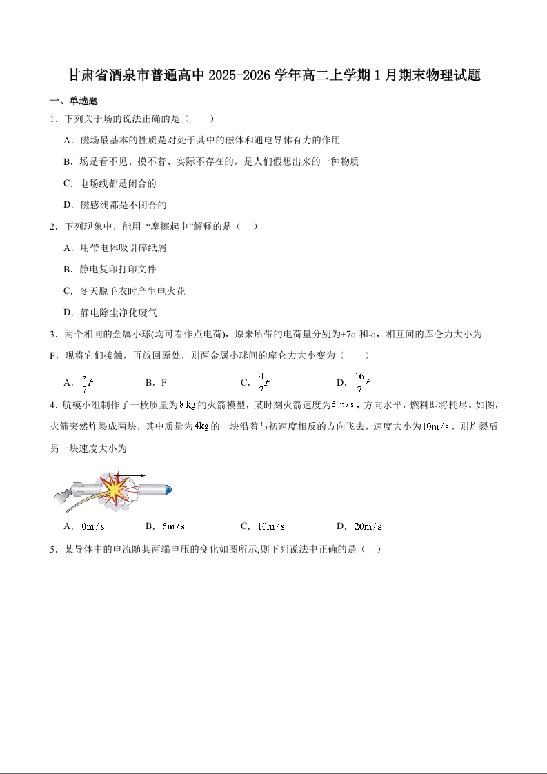 高二物理+答案--甘肃省酒泉市普通高中2025-2026学年高二上学期1月期末考试