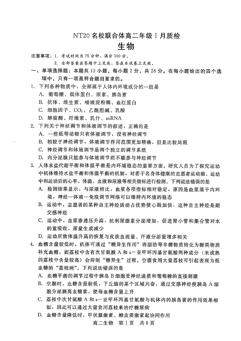 高二生物+答案--河北省邯郸市NT20名校联合体2025-2026学年高二上学期1月质检