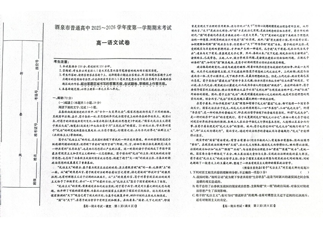 高一语文+答案--甘肃省酒泉市普通高中2025-2026学年高一上学期1月期末考试