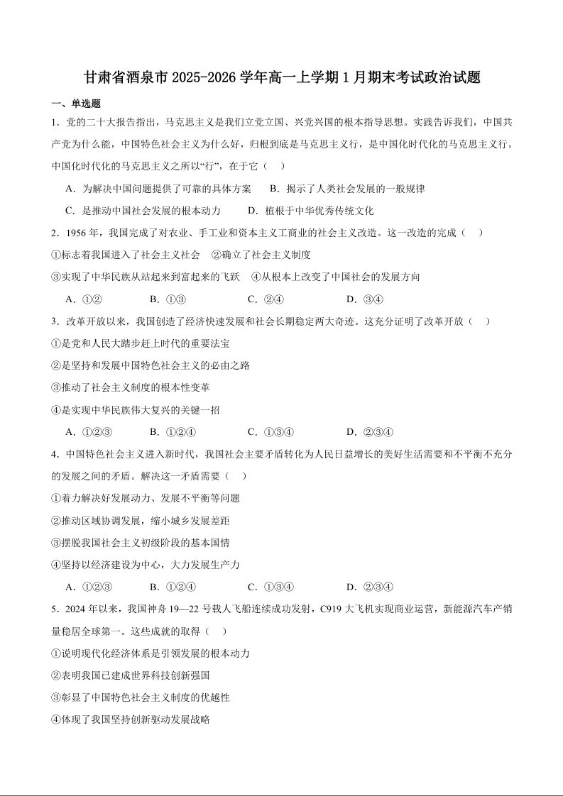 高一政治+答案--甘肃省酒泉市普通高中2025-2026学年高一上学期1月期末考试