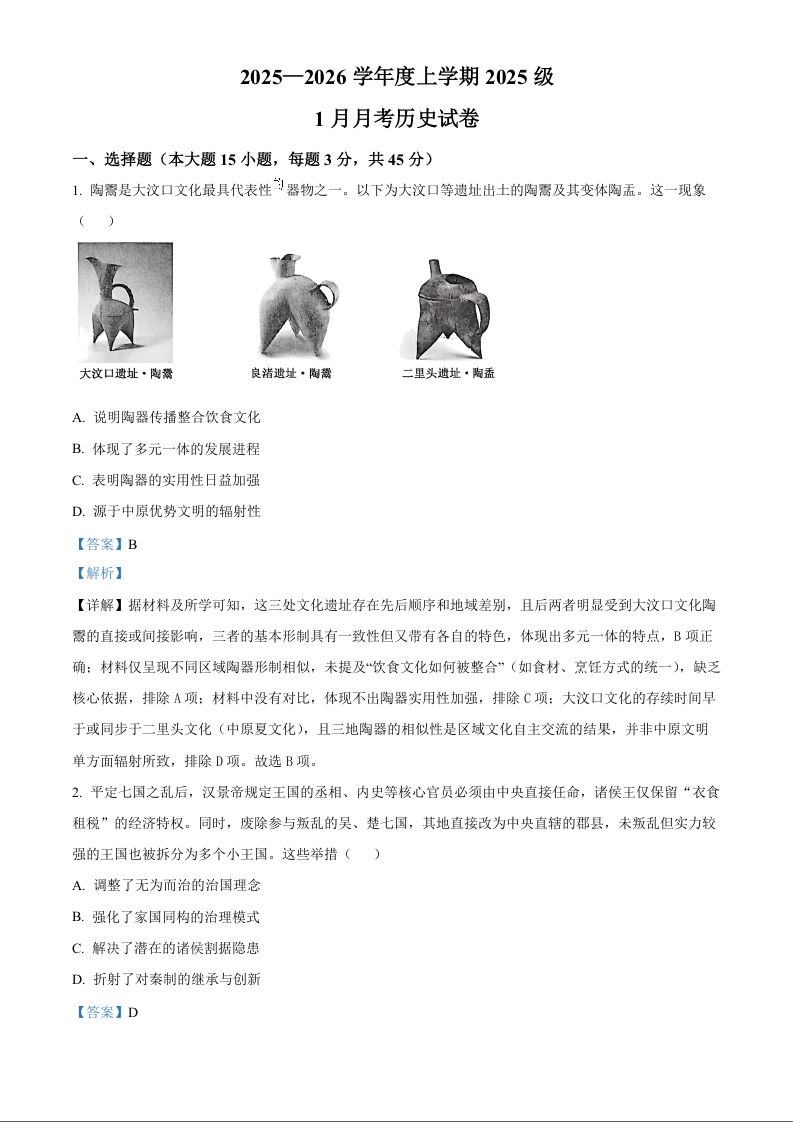 高一历史(解析版)--湖北省荆州市沙市中学2025-2026学年高一上学期1月月考