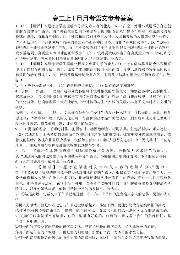 高二语文答案--湖北省荆州市沙市中学2025-2026学年高二上学期1月月考