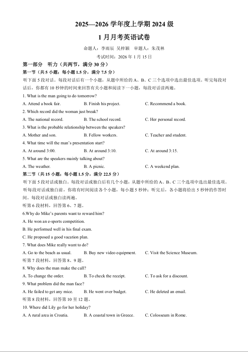 高二英语+答案--湖北省荆州市沙市中学2025-2026学年高二上学期1月月考
