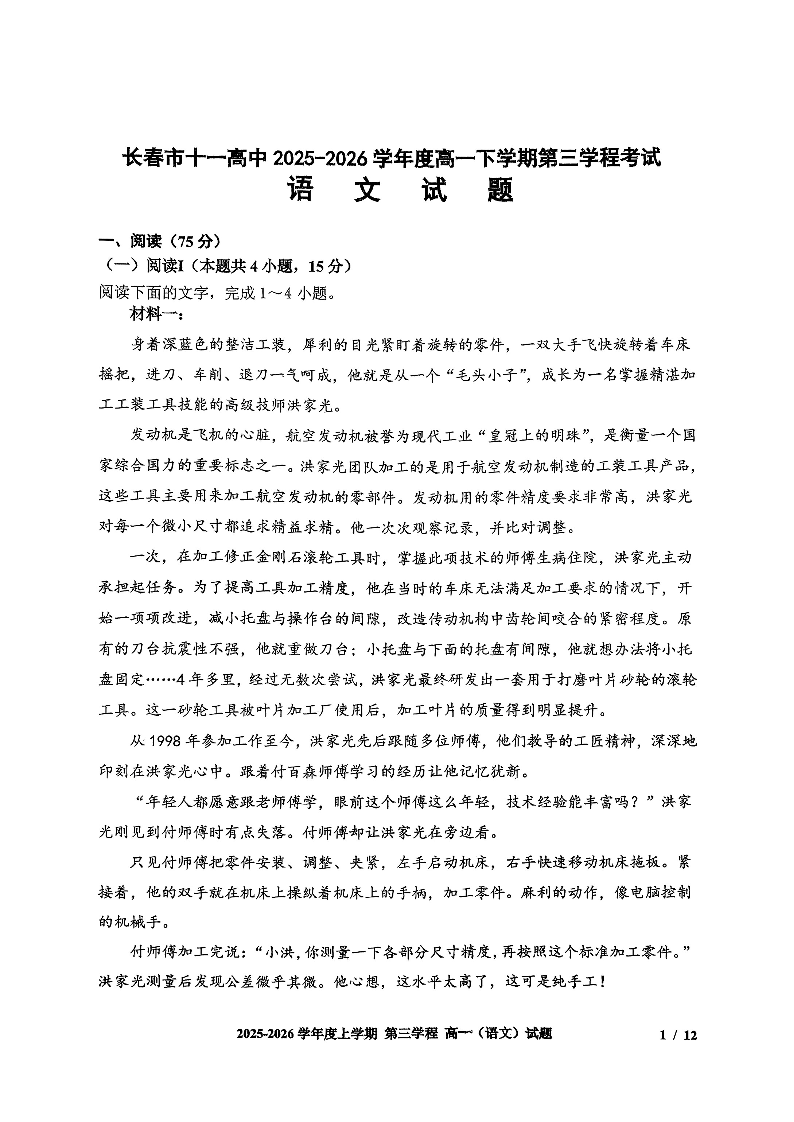 高一语文--吉林省长春市第十一中学高中2025-2026学年1月高一上学期第三学程考试暨期末考试