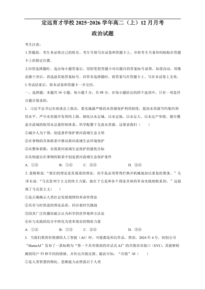 高二政治+答案--安徽省滁州市定远县育才学校2025-2026学年高二上学期12月月考
