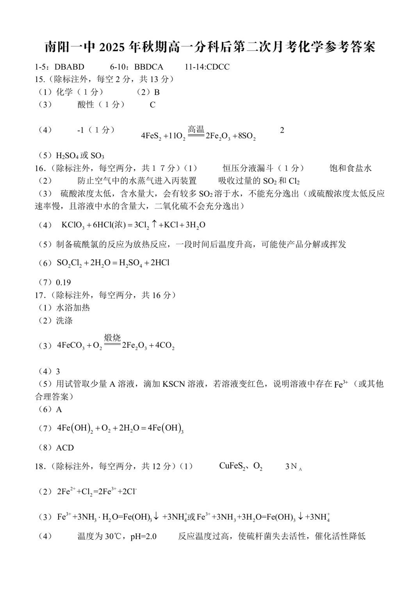 高一化学答案--河南省南阳市第一中学校2025-2026学年高一上学期分科后第二次月考