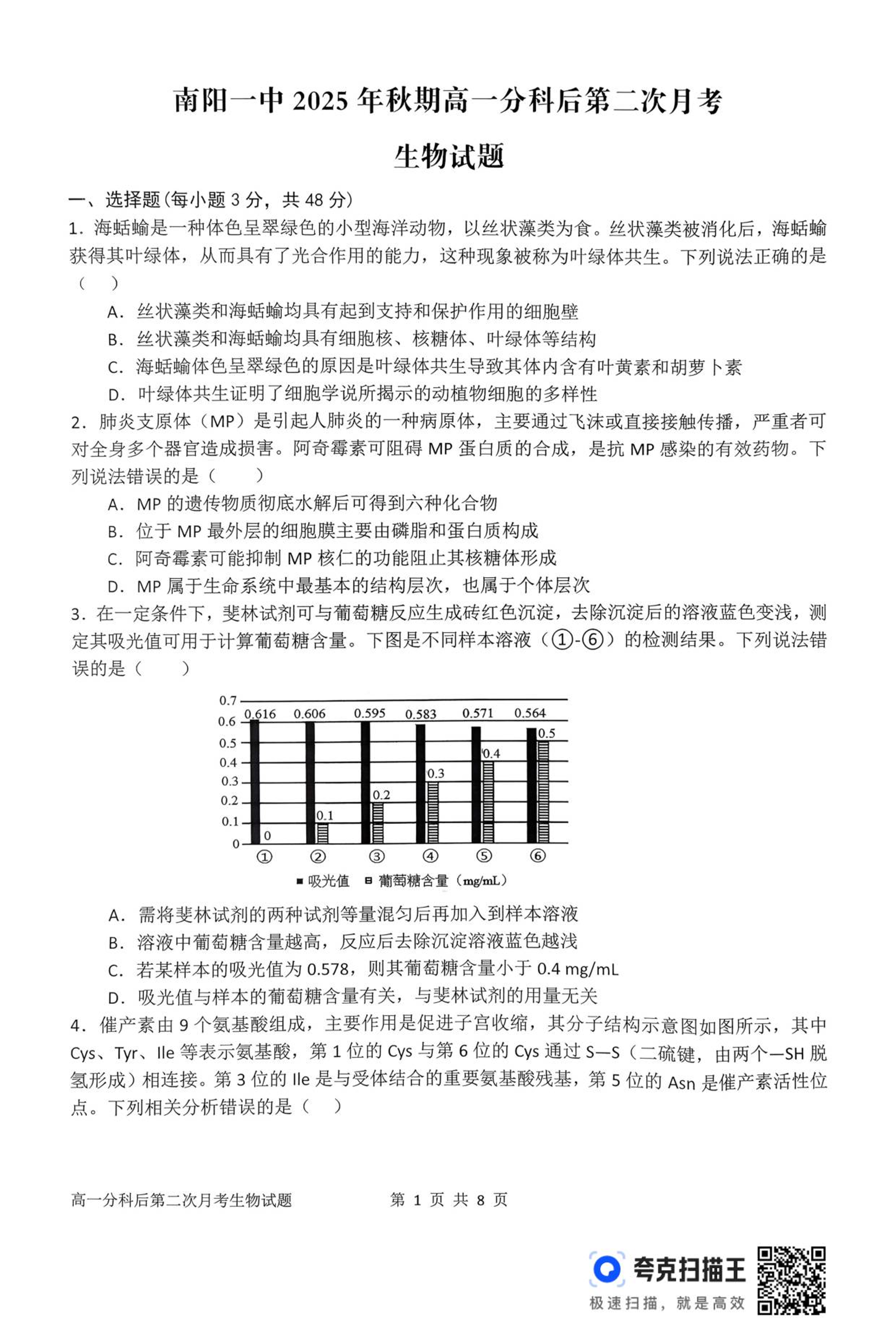高一生物--河南省南阳市第一中学校2025-2026学年高一上学期分科后第二次月考