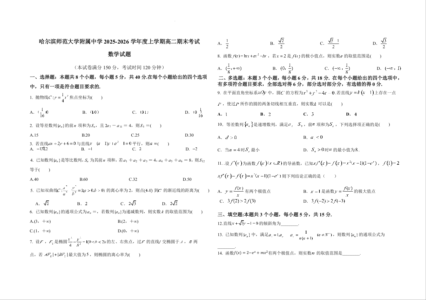 高二数学--黑龙江省哈尔滨师范大学附属中学2025-2026学年高二上学期期末