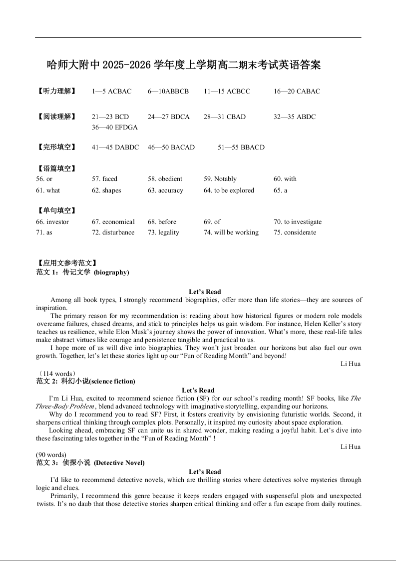 高二英语答案--黑龙江省哈尔滨师范大学附属中学2025-2026学年高二上学期期末