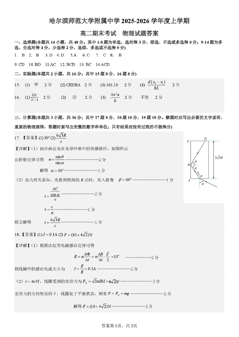 高二物理答案--黑龙江省哈尔滨师范大学附属中学2025-2026学年高二上学期期末