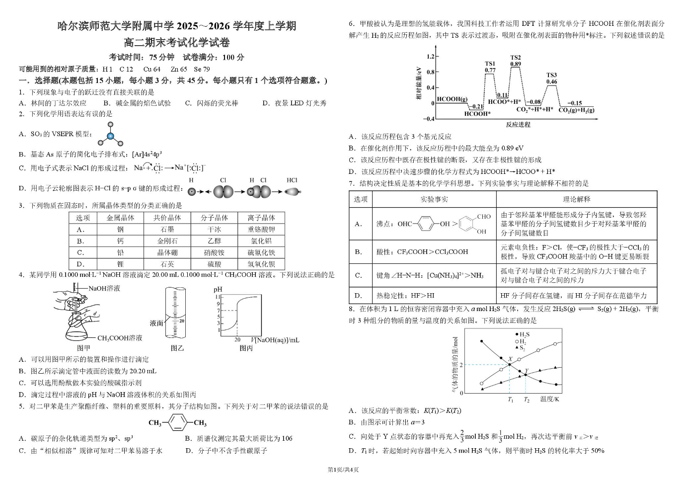 高二化学--黑龙江省哈尔滨师范大学附属中学2025-2026学年高二上学期期末