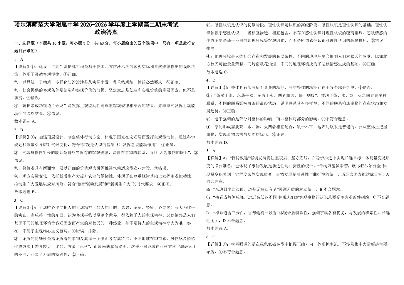 高二政治答案--黑龙江省哈尔滨师范大学附属中学2025-2026学年高二上学期期末