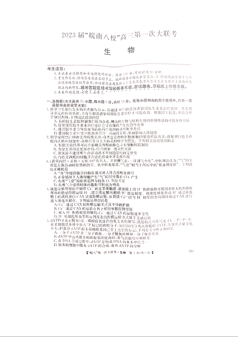 高三生物--安徽省“皖南八校”2023届高三上学期第一次大联考