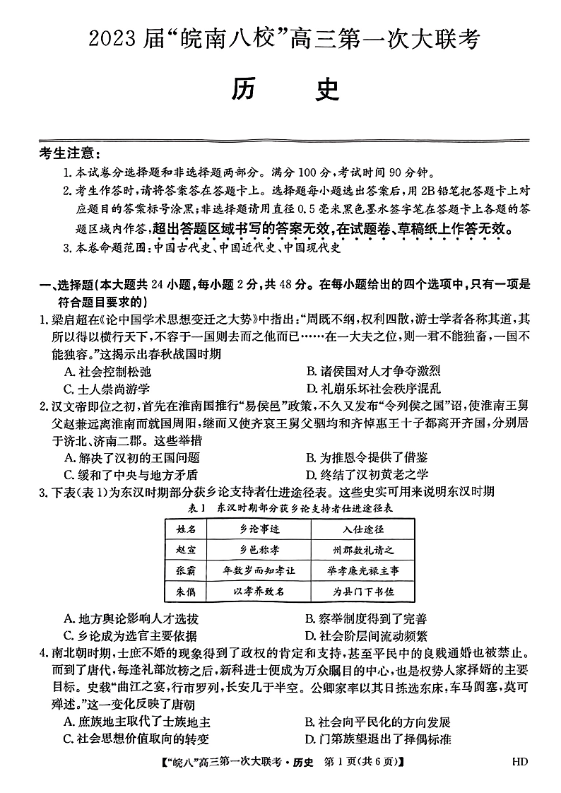 高三历史--安徽省“皖南八校”2023届高三上学期第一次大联考