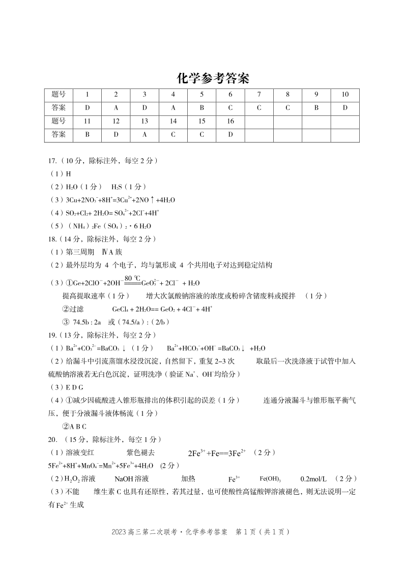 高三化学答案--安徽省省示范高中2023届高三第二次联考