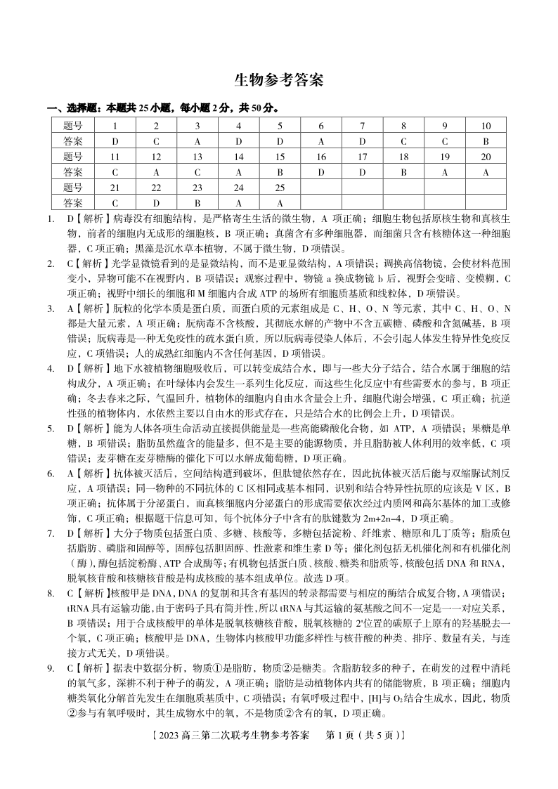 高三生物答案--安徽省省示范高中2023届高三第二次联考