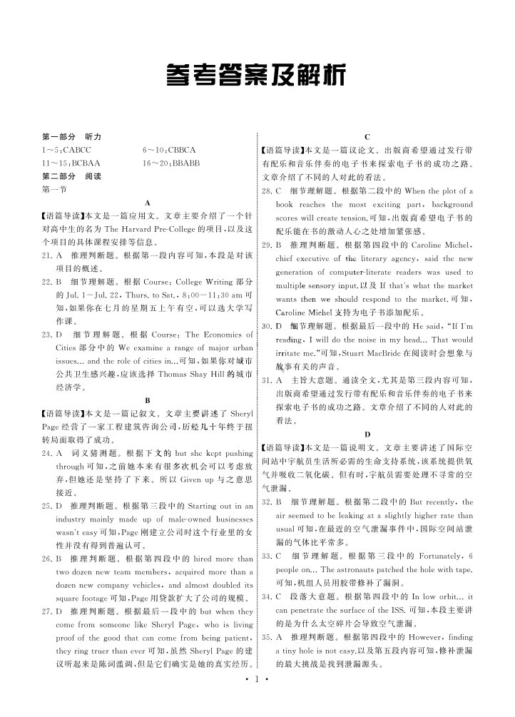 高三英语答案--甘肃省张掖市高三上学期第三次检测