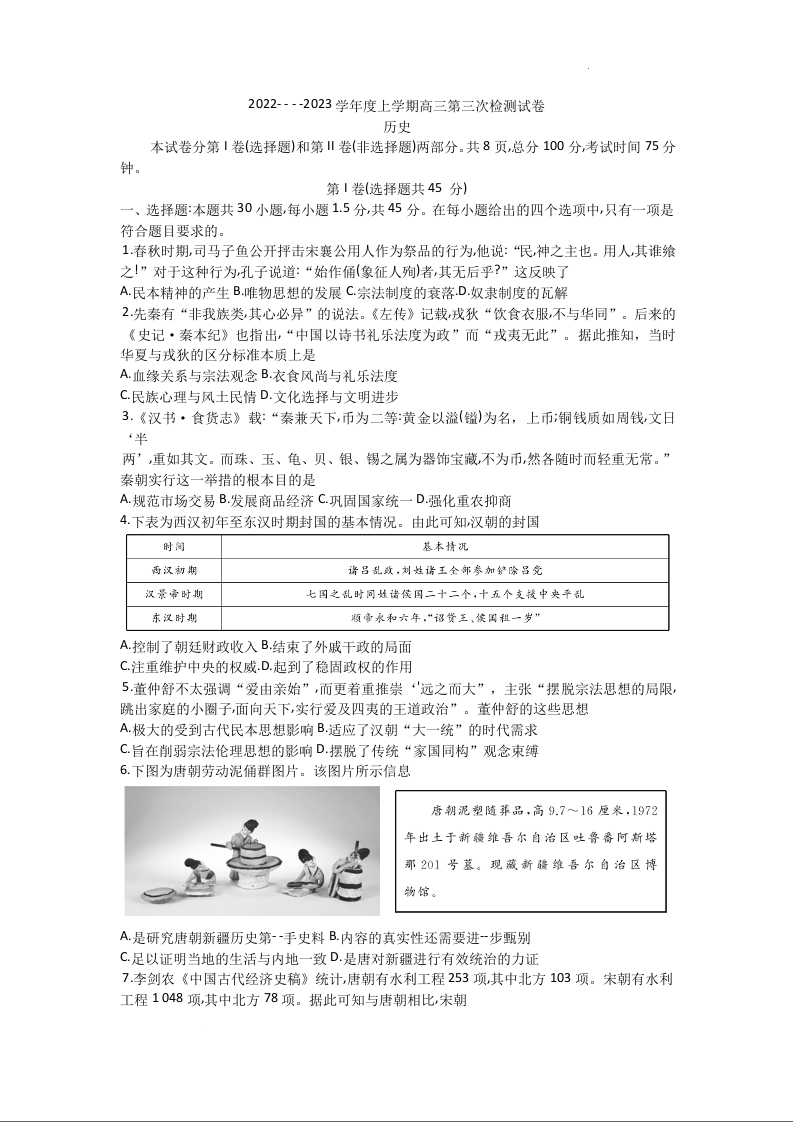 高三历史--甘肃省张掖市高三上学期第三次检测