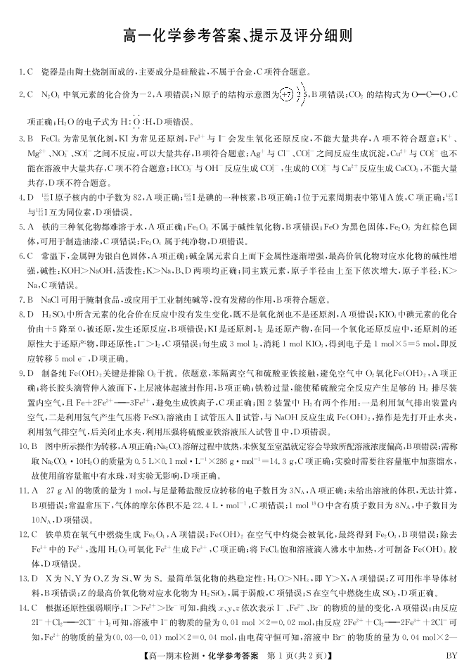 高一化学答案--甘肃省白银市靖远县第一中学2025-2026学年高一上学期1月期末