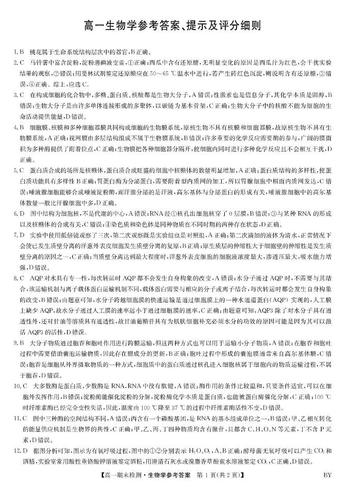 高一生物答案--甘肃省白银市靖远县第一中学2025-2026学年高一上学期1月期末