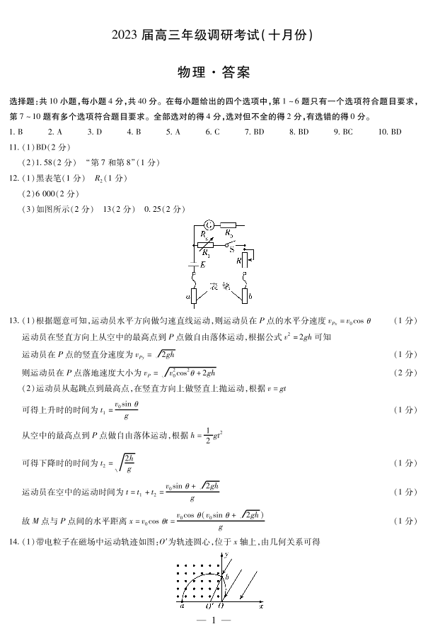 高三物理答案--河南省安阳市高三上学期毕业班调研考试(10月份)