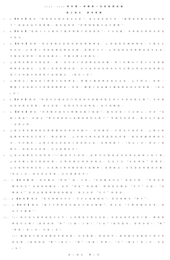 高三语文答案--河南省部分名校2022-2023学年高三上学期第一次阶段测试