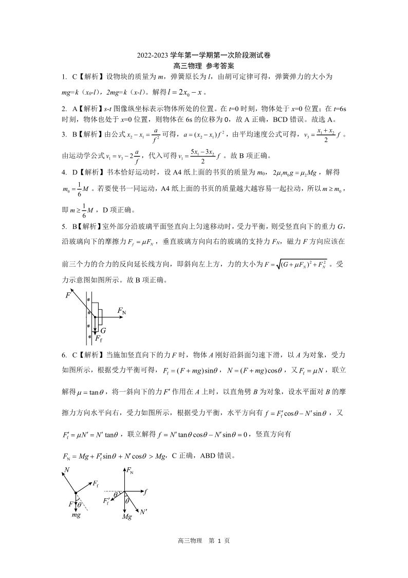 高三物理答案--河南省部分名校2022-2023学年高三上学期第一次阶段测试