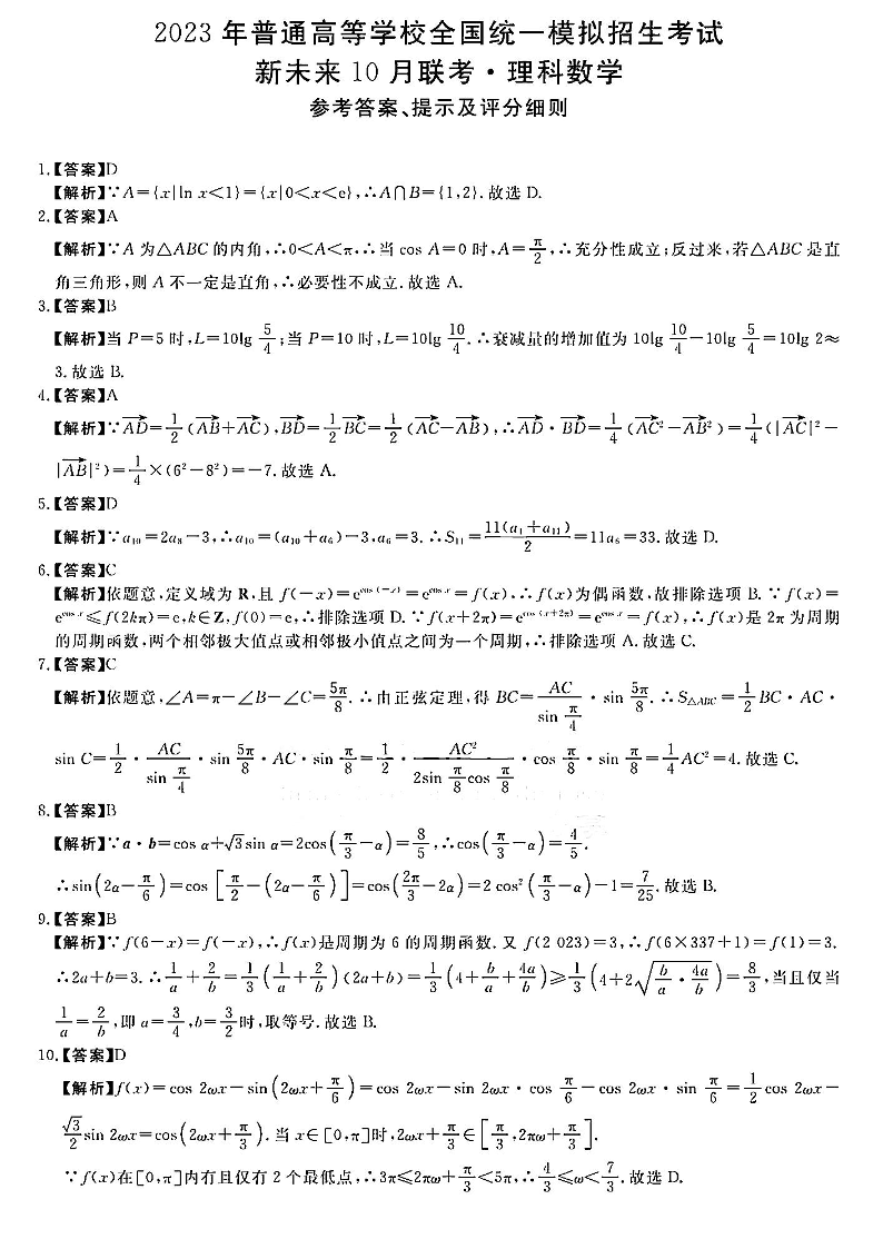 高三理数答案--河南省名校(新未来)高三上学期2023届10月联考10.28-29