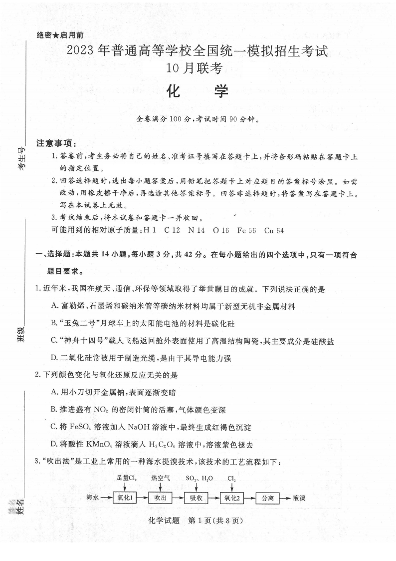 高三化学+答案--河南省名校(新未来)高三上学期2023届10月联考