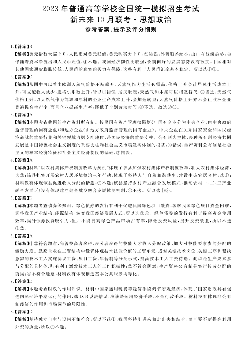 高三政治答案--河南省名校(新未来)高三上学期2023届10月联考